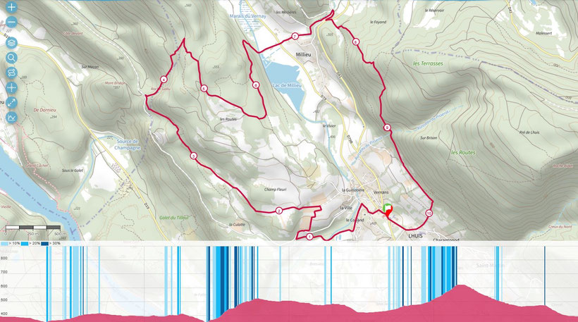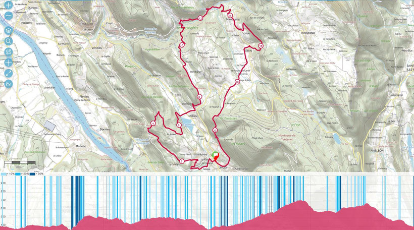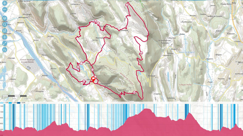 Ce format est suffisamment long pour se faire mal ou pour se faire plaisir (ou les deux :-)), et suffisamment court pour que les non initiés se lancent dans l'aventure sans stress. Il faudra tout d'abord passer le mur de Roche-Gallu au km3,5, petit "coup de cul" qui mettra de l'ordre dans la hiérarchie des grimpeurs. Les sprinteurs pourront toujours se rattraper dans la descente qui mène à la magnifique cascade de la Brive mais s'en suivront 3km de côte plutôt roulante pour atteindre la carrière de Cerin et son ambiance minérale. Quelques bosses et singles descendants plus tard, le village de Lhuis sera surplombé, il suffira alors de se laisser guider par la douce voix du speaker jusqu'à la ligne d'arrivée.